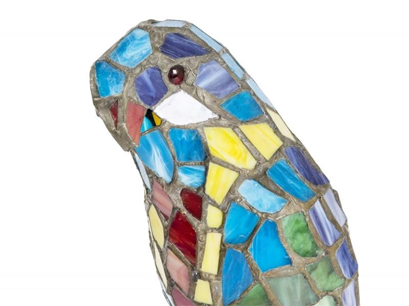 Lampada da tavolo in stile Tiffany a forma di pappagallo realizzata con vetri colorati legati tra loro con strisce di piombo. Base in resina color bronzo con decoro a fiori. Misure: 15×13 altezza 40cm